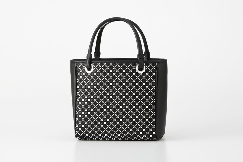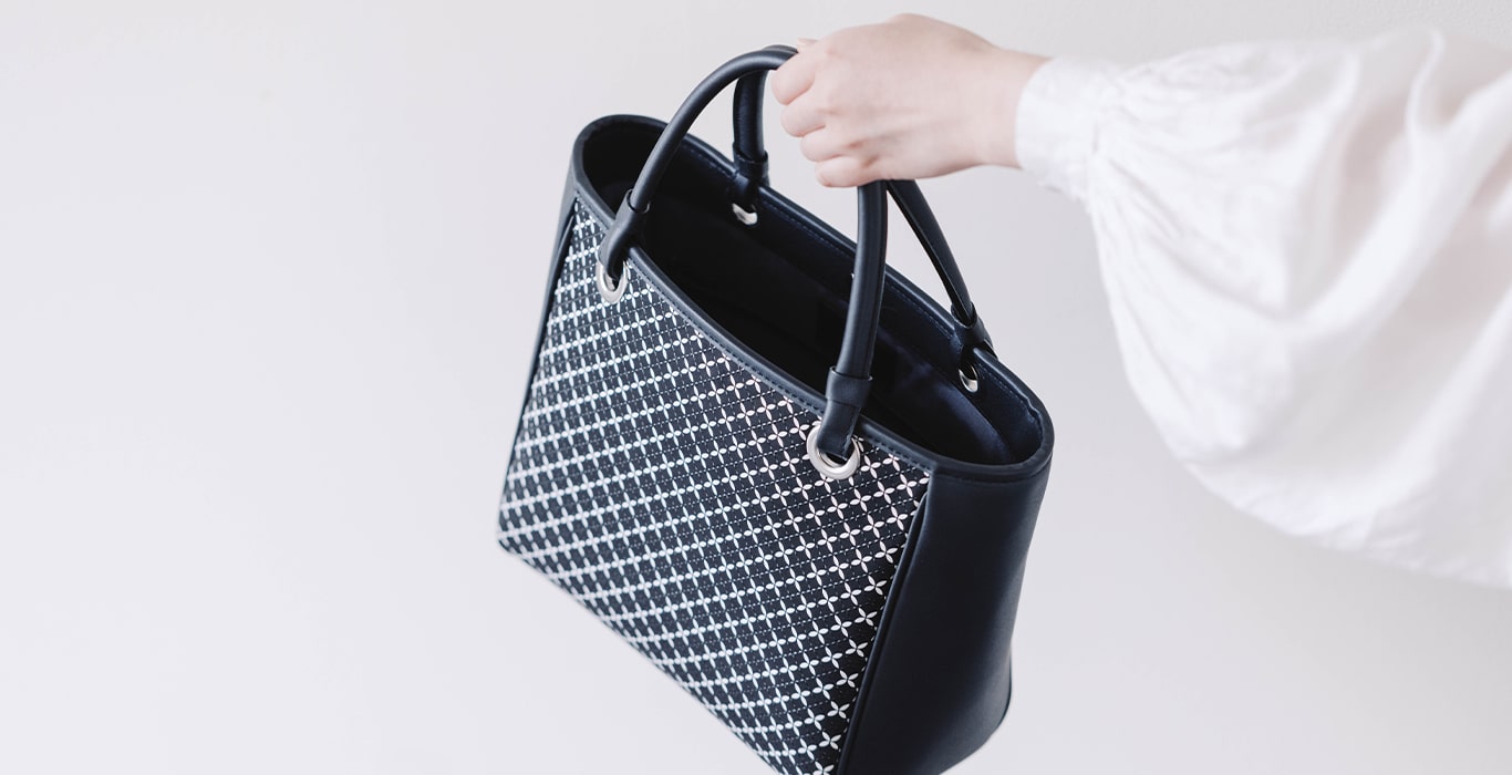 コンパクトに見えて、底マチが広いため、しっかり収納できる大きさです。内側にある複数のポケットで中身の整理も簡単です。 幸せや縁が広がっていく模様とされる伝統的な七宝繋ぎの柄を、白更紗と黒漆のコントラストで描いた人気の手提げバッグ