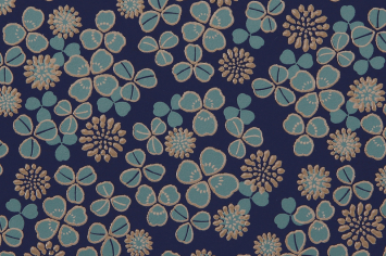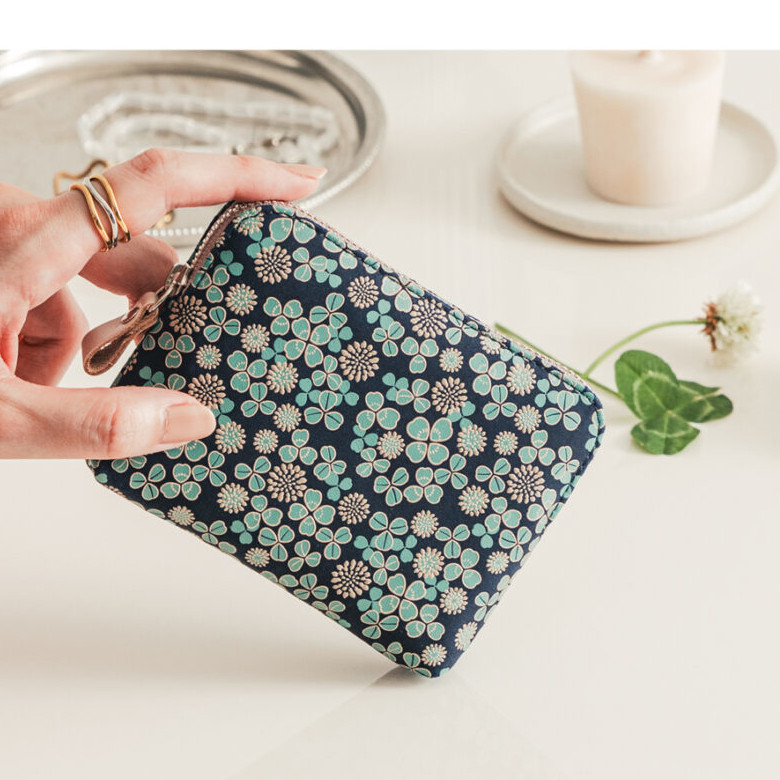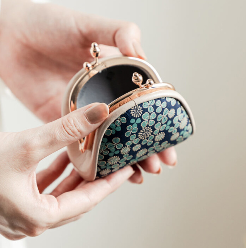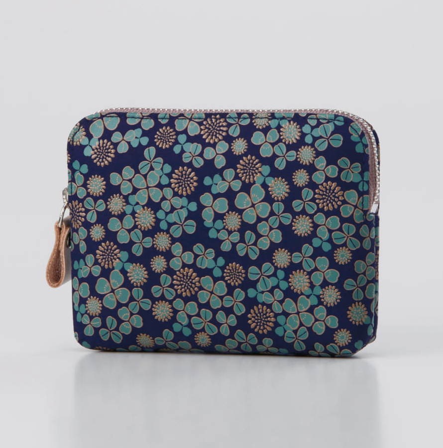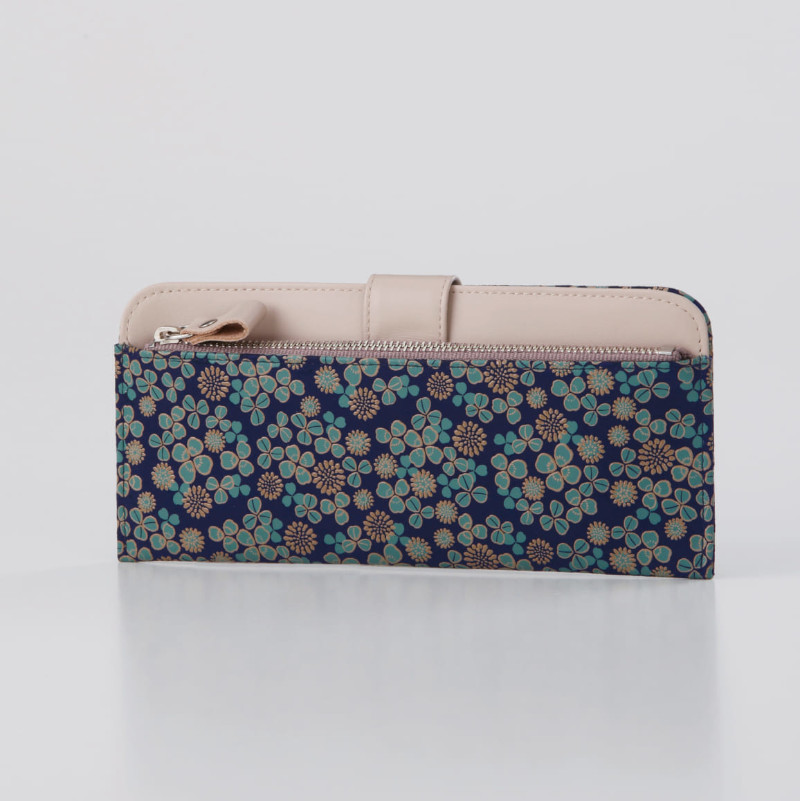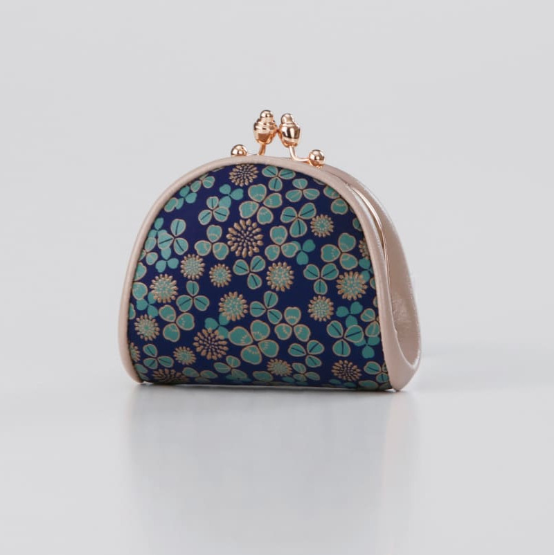 紺色の鹿革に、三つ葉とこんもりした花をパステルグリーンの更紗と白漆でつくりあげた印傳屋さんオリジナルの模様。敷き詰めた葉の中には、幸運を象徴する四つ葉が隠れています。