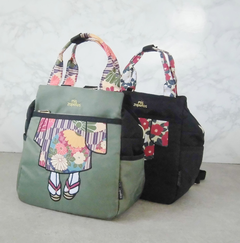 ミスサパトはスペイン語で『私の靴』。着物姿に草履をあしらった個性的なバッグです。 ころんとした形が可愛い着物柄を合わせたリュック。大きすぎず、手持ちにもショルダーにもなる使いやすいサイズ感です