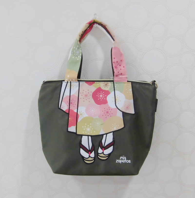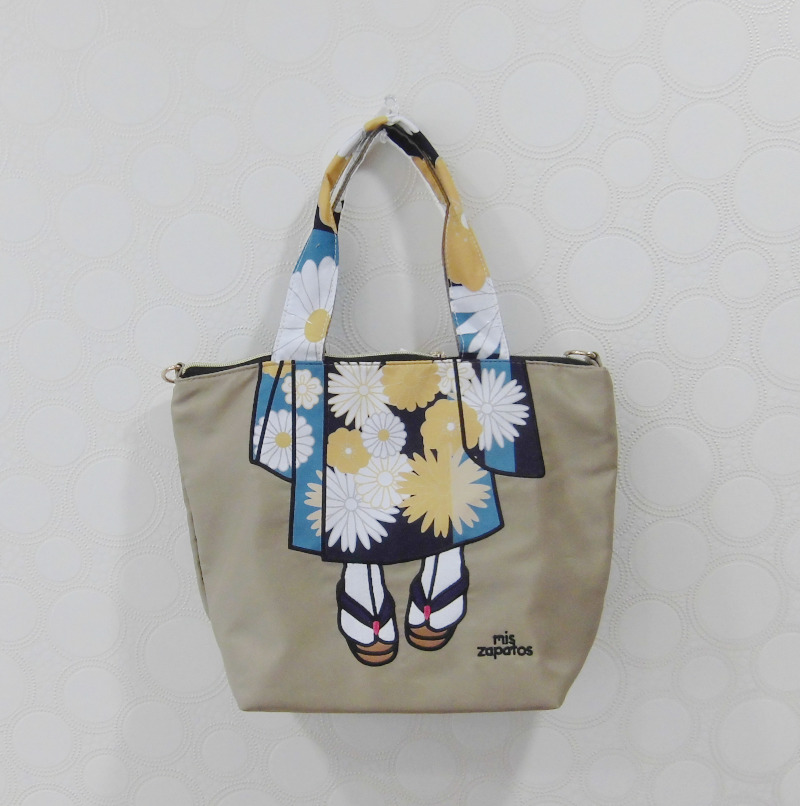 鮮やかな花柄の着物が個性的にデザインされたナイロン生地のトートバッグ。ショルダー用のストラップもついています。 ミスサパトはスペイン語で「私の靴」着物柄なので足元は草履になっています